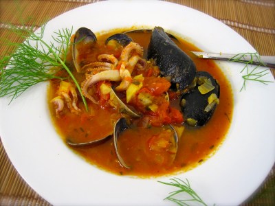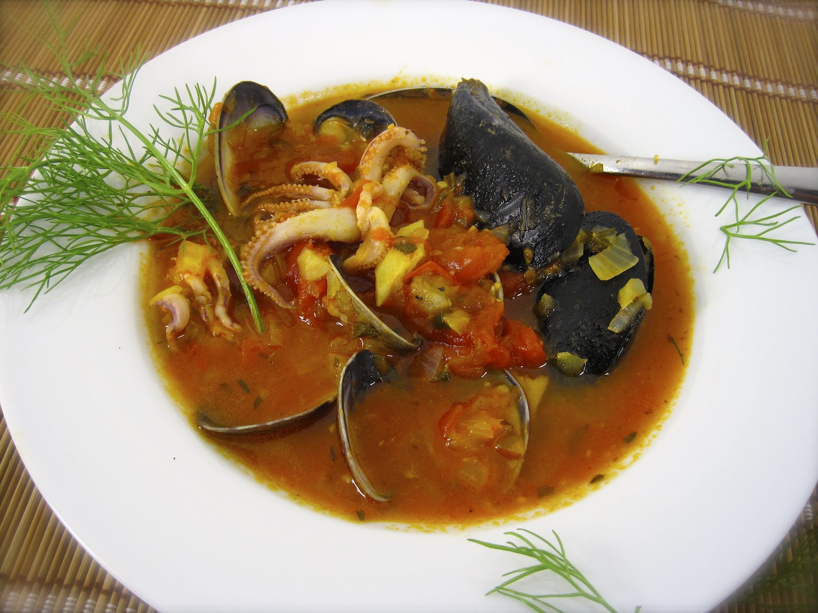 This past weekend, my husband and I had the pleasure of cooking dinner for some dear friends of ours. As is my custom, I ended up buying far too much shellfish for the seafood pasta main dish. Thankfully I was able to use the leftover seafood to make a delicious and easy Cioppino for Monday night’s dinner. The seafood was originally cooked in white wine, tomatoes, garlic onion and a little lemon juice, so the flavors and the leftover broth easily blended into the soup.