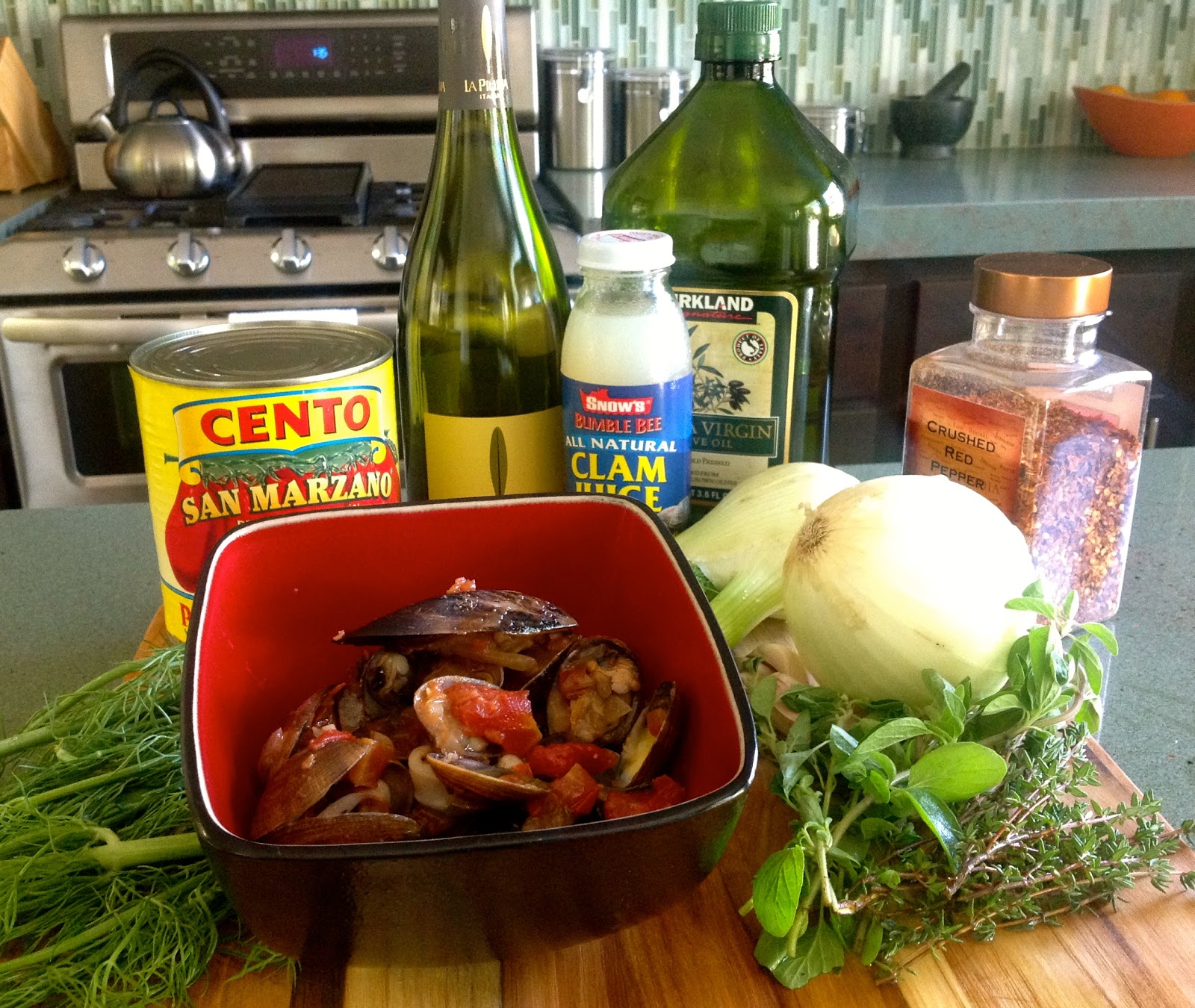 The ingredients were simple–a can of whole, peeled tomatoes, a bottle of clam juice, some leftover white wine from the weekend dinner, red pepper flake, onion, garlic, fennel bulb, thyme, oregano and of course, olive oil.