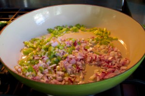 First, warm the stock in a separate saucepan and set aside a ladle–you’ll use this to add the stock to the risotto. Add about a tablespoon of olive oil to a pan and sauté the onion, garlic and celery for about four minutes. Then add the rice to the pan and sauté to coat with the oil. After about two minutes, add two ladlefuls of the stock to the rice mixture. Stir constantly until most of the liquid is absorbed. Continue to add the stock little by little, making sure that between each ladleful, the liquid is mostly absorbed. After about 10 minutes of cooking, add the chopped herbs, lemon zest and the asparagus. I made a last minute addition of sliced mushrooms and frozen green peas to the mix because it just seemed like a good thing to do (and it was)! Continue cooking for another 10 minutes or so, or until the rice is tender. Season with salt and pepper (to taste). Add the lemon juice and parmesan cheese at the end. Be careful not to let the mixture become dry. If it does, just add more stock or other liquid. I actually added a little white wine to it after I ran out of stock.