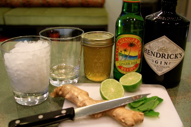 Pour the 1/2 oz ginger syrup into a glass with the mint leaves. Muddle the mint leaves in the ginger syrup until the mint leaves release their flavor. Pour ice into the glass, then the gin and the lime juice (I find that one half of a lime is almost exactly 1/2 oz). Top the drink with the ginger ale. Now, I like a more intense ginger flavor than regular ginger ale, so I like to use “Reed’s Extra Ginger Brew”. It really has a nice, strong ginger bite! Stir with a spoon from the bottom up and enjoy! Now, how easy was that? Happy Friday, everyone!