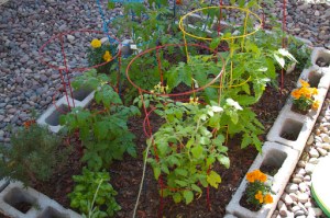 This past week, I noticed that the beautiful petunias were getting ravaged by caterpillars. I started pulling them off by hand, but quickly realized that this was a losing, uphill battle and instead bought some organic pest control for the ornamental flowers. Since it seems that the dinner bell has rung for the pests, I decided to pretty up the vegetable garden with some marigolds. I have always heard that marigolds repel certain insects that prey on vegetables and keeping last year’s pest problem in mind, I decided to plant the marigolds in the empty spaces in the cinderblocks as a kind of force field. I’ll let you know if it’s successful, but in the meantime, it is really pretty! I think I’ll pick up a bunch more this weekend to fill the rest of the holes.