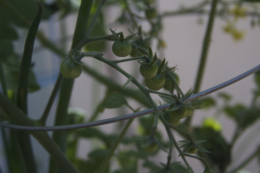 The tomatoes in the traditional soil bed are doing really well. All of the plants except one variety, the “Early Girl” are in bloom and have set fruit. The “Early Girl” tomato in the aquaponic garden hasn’t bloomed either, so I’m not going to worry about them yet.