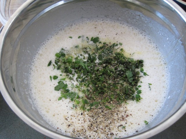 In another bowl, whisk the milk and the yogurt until smooth.  Pour the egg mixture through a mesh sieve held over the milk and yogurt mixture.  This will remove any lumps of flour.   Whisk in the salt, pepper and herbs.