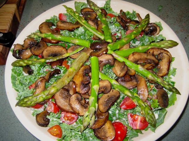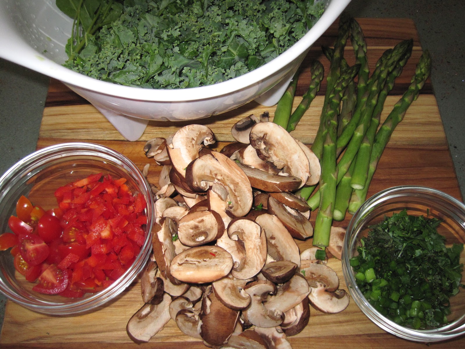 Since I’m always looking for opportunities to add more vegetables to a dish, I also added quartered grape tomatoes along with some tomatoes from the garden, two tablespoons of chopped red bell pepper, fresh arugula and sautéed mushrooms.  You can also use whatever combination of herbs that you enjoy.  I used a tablespoon of thyme, along with some minced parsley and sage and green onion that I had in the garden.