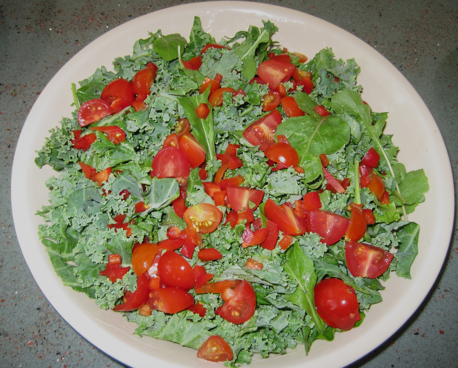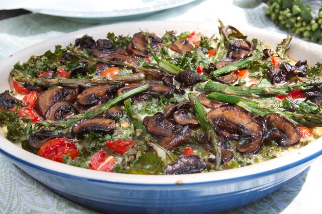 This morning, I decided to make a quiche for breakfast.  I love quiche. In fact, I love all kinds of egg custard type dishes, but quiche is near and dear to my heart and has been a favorite of mine since I was fairly young.  I was first introduced to the wonders of this eggy concoction when I was in middle school.  There was a product in the…ahem…1980’s that was called “pour-a-quiche” and my mother used to buy it.  Now, this product came in a milk carton and it was just as the name said, you simply poured the pre-made quiche mix into a ready-made pie crust and popped it into the oven!  Hey, we liked instant stuff back then!  Later on, when I went to college, one of favorite professors, who was also a  fabulous gourmet cook, made me one of her quiches.  It was the most amazing, decadent, wonderful dishes I had ever had.  It was lovingly baked in a homemade, buttery pie crust and filled with spinach, bacon, ham and cheeses. It was divine. It was rich. It was completely calorie-laden, but that didn’t matter because I had the metabolism of a 20 year old!  She gave me the recipe, which took about two days to make.  Now, when you’re in college, you simply cannot fathom anything taking two full days to get onto the table (hello, Top Ramen) and sadly I never made that recipe.  Now fast forward to today, and though I still love quiche, I make it a lot less decadently, because my 40-something metabolism just isn’t what it used to be.  You’ll notice that the quiche is missing a crust and it’s also missing something else: cheese.  But it’s loaded with a lot of great vegetables and leafy greens and it still tastes a little bit decadent!