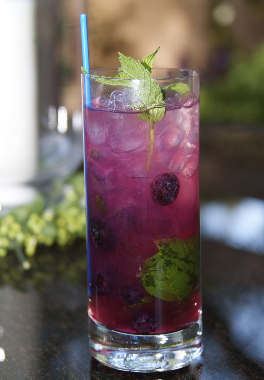 - Muddle the mint leaves, simple syrup and half of the blueberries (about 6 blueberries) in the bottom of a cocktail glass.