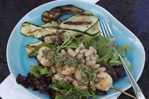 Dress your salad greens with half of the vinaigrette. Spoon the beans over the greens and top with a skewer of scallops. Spoon the salsa verde over the scallops!