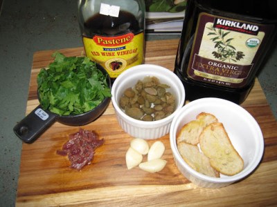 A word about capers. You can use either the non-pareil capers in brine found at most grocery stores, or the salt packed type. For the first time, I used salt-packed capers that we found at an Italian market. They are larger than the non-pareil and require a little more preparation to remove the salt. If you want to use salt-packed capers first rinse them very well in cool water. Then allow the capers to soak for about 15 minutes and drain prior to using.
