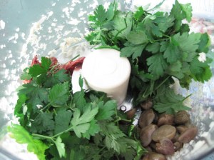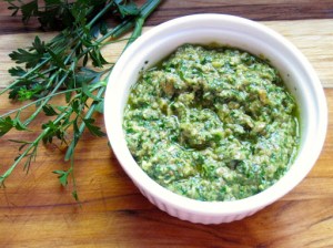 Add the garlic to a food processor or blender and mince finely (this can also be done by hand). Add the parsley, capers, anchovies to the bowl and pulse until combined. Then add the bread and olive oil mixture and pulse until all the ingredients are blended together. That’s it!
