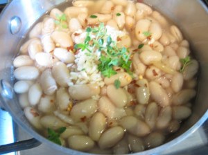 The rest of the meal was equally simple. Pour a can of cannellini beans (or small white beans) in a saucepan and add a sprig of thyme (stems removed), one clove of minced garlic, a pinch of red pepper flake and a pinch of salt. Heat gently over low heat for about 10 minutes to allow the flavors to combine. Remove from the heat and drain the beans.