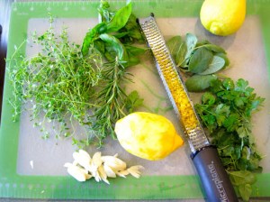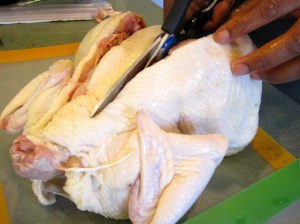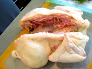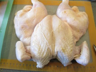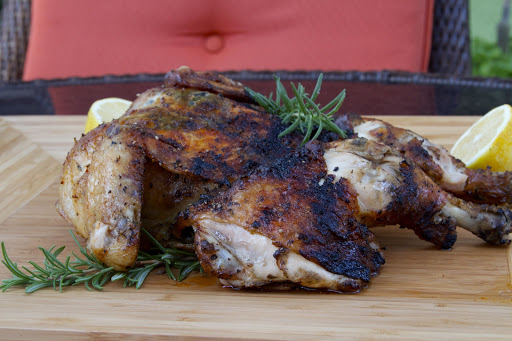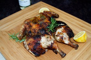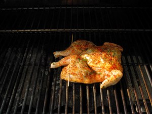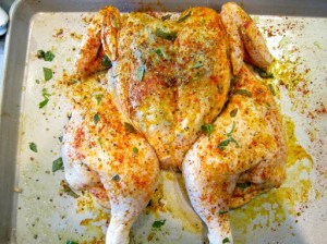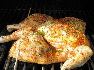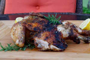 Meanwhile, I spatchcocked a chicken and cooked it on the grill. This past weekend, we had record high temperatures: 112 degrees on Saturday! This means that it’s officially time to retire the use of the indoor oven and cook everything outside. Eric’s favorite dish is roasted chicken. I have cooked a whole chicken on the grill before, but found that it was a little difficult to cook the whole bird thoroughly without drying the breast. This time I decided to spatchcock (or butterfly) the chicken so that it will lie completely flat on the grill and thus, cook more evenly. I used the same herbs and seasonings that I use when I roast a whole chicken in the oven, but instead of stuffing the cavity with them, I slipped them underneath the skin.