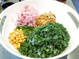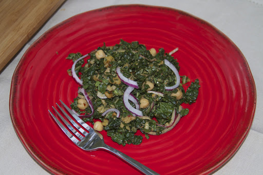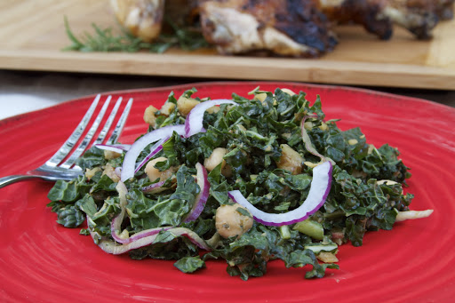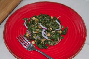 Many times I’ve had kale salads that just weren’t up to snuff. They were very pretty, but the texture and flavor was somehow lacking, and eating it made me feel as if I were doing some sort of penance for a wrongdoing in a former life. Don’t get me wrong, I love kale! I saute it; I put it in quiche; but sometimes a raw kale salad can be a little challenging–oh, the constant chewing! Last week I received this recipe via email and had to try it that day! I was initially drawn to it because I already had almost all of the ingredients in the pantry, except for one: pomegranate molasses, and had to substitute regular molasses for it. It wasn’t quite a substitution, because pomegranate molasses has a unique sour/sweet flavor that I really couldn’t replicate using ingredients I had on-hand. That’s not to say it wasn’t delicious, because it was, but I was anxious to know what it would taste like with the original ingredient. So, on a tip from a friend, I found a a Mediterranean market and purchased a bottle of pomegranate molasses. Turns out it’s a very inexpensive ingredient (less than $3) and I can’t wait to find some more uses for it…I’m thinking some kind of sauce. Anyway, I digress! I made the recipe again this past weekend and it was amazing. I made a few changes to the original recipe, mainly adding thinly sliced red onion and chickpeas to the salad, as well as chili sauce to the dressing. I used regular curly leafed kale the first time that I made it, but the second time, I used lacinato, or dinosaur kale. Both types of kale were equally delicious!