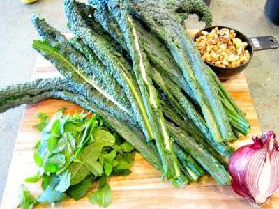 Place all the ingredients for the dressing in a blender or food processor and puree. Drizzle the dressing over the kale and mix thoroughly. The salad holds up very well with the dressing and is even great the next day as leftovers.