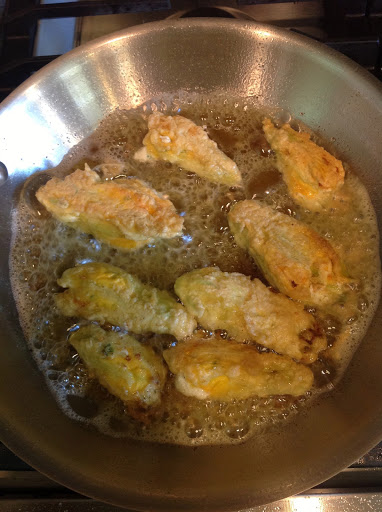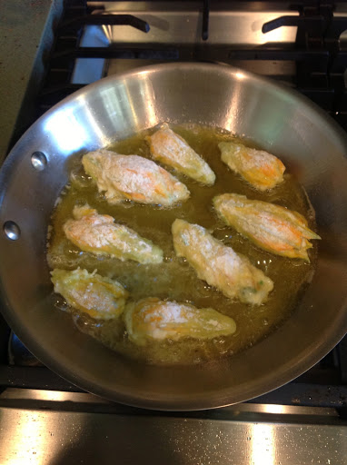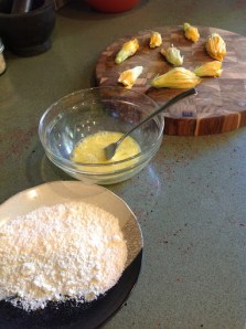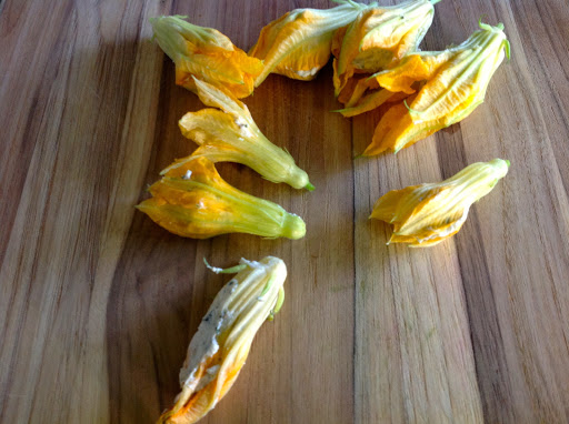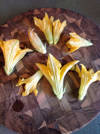 As I mentioned, the squash blossoms should be harvested first thing in the morning when they open. The male blossom is on a long, thin stem, and as long as there are no female blossoms open that need to be fertilized, the male flowers are pretty much for show (and for eating)! Snip the blossoms, then take your scissors and carefully snip and remove the stamen (the protrusion in the flower that is covered in pollen) and place them in a bowl of cold water. These flowers can be stored in the refrigerator for two days in the bowl of water. When you are ready to make them, rinse them and remove the stems.