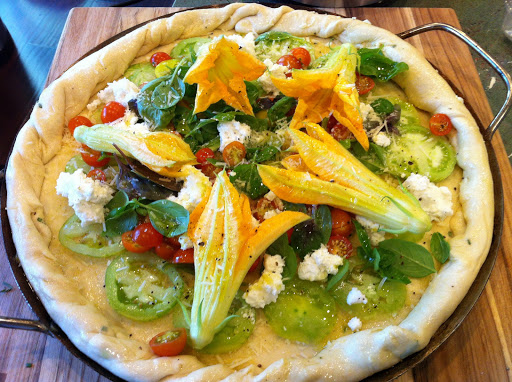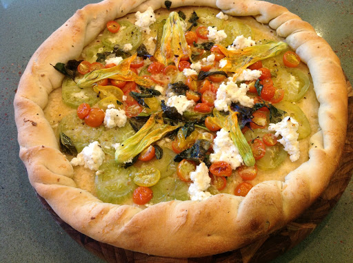 Here’s another fun thing we made with the squash blossoms: pizza! I’m pretty proud of this pizza because all of the vegetables on it, with the exception of garlic, came from our little garden! For this white pizza, I used sliced green zebra tomatoes, cherry tomatoes, basil, squash blossoms, garlic, parmesan cheese and ricotta cheese! Delicious!