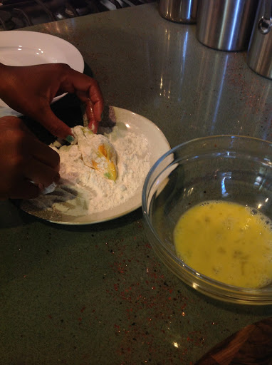 Beat one egg in a small bowl and put about 1/4 cup of all-purpose flour on a saucer.