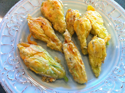 I’ve told you a little about my adventures with growing squash in my garden. The first and last legitimate zucchini was grown and eaten two weeks ago and there hasn’t been another one since. Yes, it does bother me a bit that a vegetable that is purportedly so easy to grow that a toddler could grow it has eluded me, but no matter; because this girl learns to make lemonade out of lemons! Even though I have no more mature squash to eat, I happen to have a good amount of squash blossoms on the plants that I’ve been harvesting early in the mornings and finding things to make with them. The blossoms themselves taste like a mild version of the squash. I stuffed these blossoms with a ricotta cheese and herb mixture and pan fried them. They make a delicious and delicate appetizer and they are very simple to make!