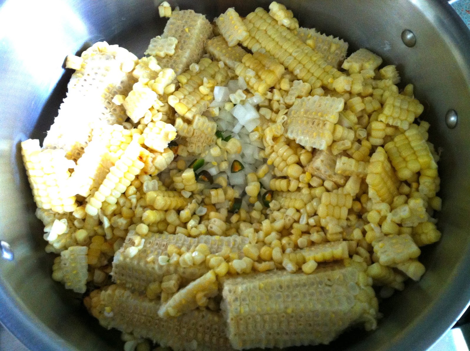 When the corn is cool enough to handle, slice the kernels from the cob and cut the cobs in half. Add the kernels, cobs, serrano pepper, 1 cup of the chopped onions and salt and pepper to a large saucepan or pot. Add the vegetable broth and water and cook for about 20 minutes, or until the broth has reduced.