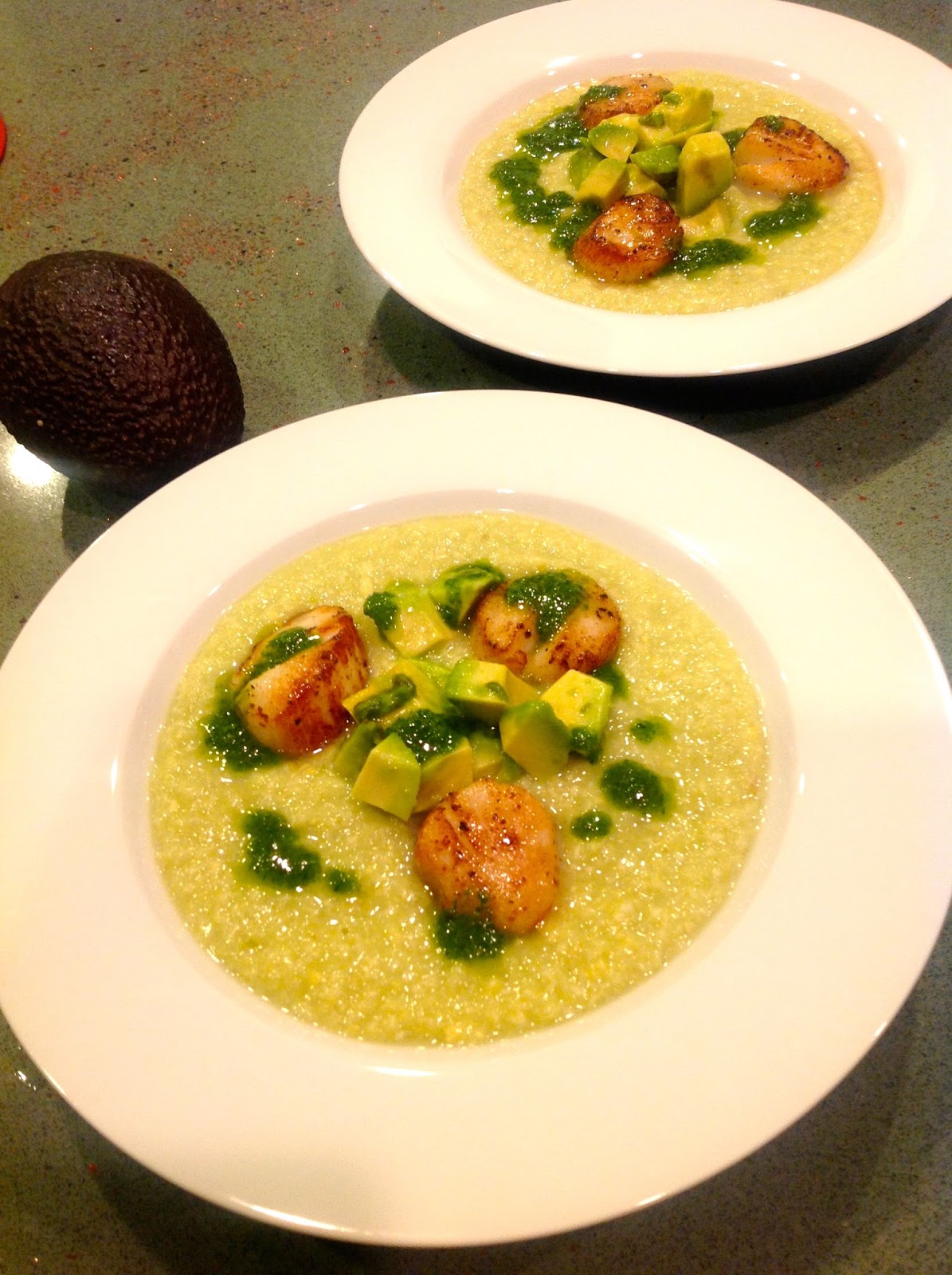 Serve the soup with avocado and the cilantro oil drizzled over the top. As you can see from the photo, I served it topped with seared scallops. Grilled shrimp would be equally fantastic!