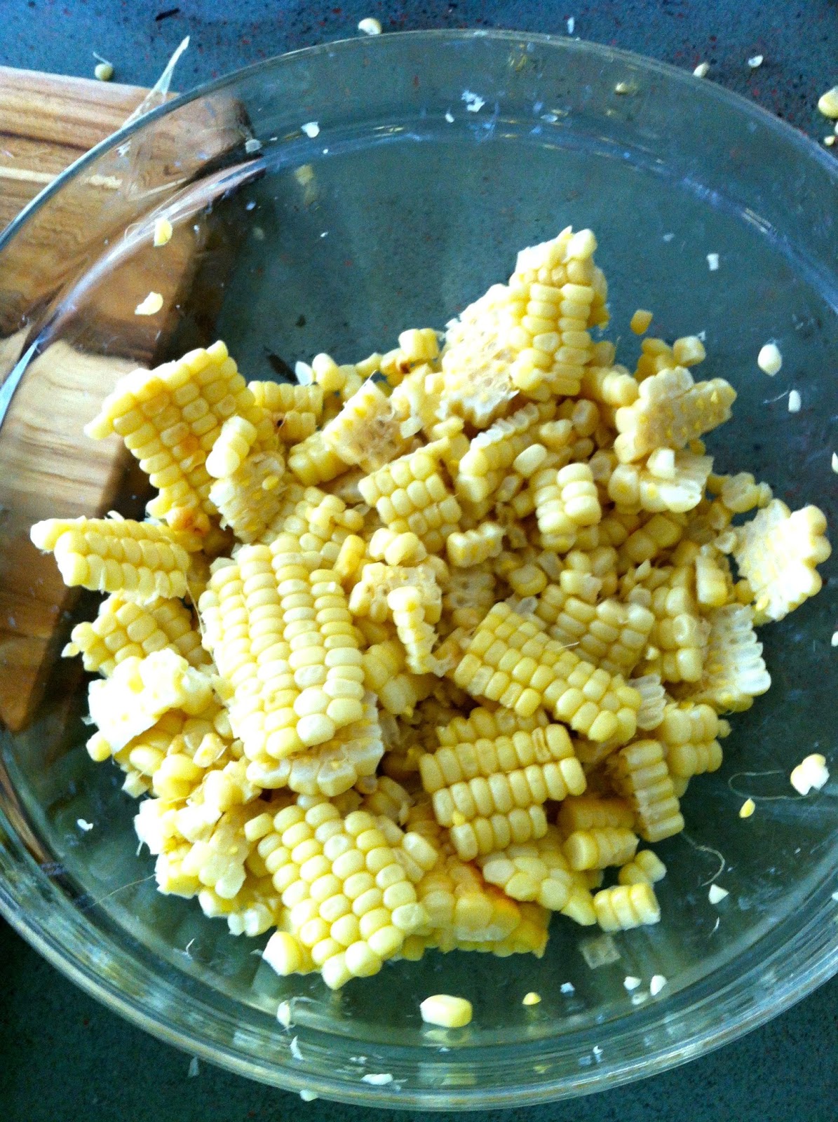 I thought of making a cold soup because, let’s face it, we in Southern Nevada apparently live on the surface of the sun. Temperatures soared to 116 degrees this weekend and anything cool and refreshing was a most welcome thing. I adapted this recipe found on Epicurious and I used a lot more corn and I also did not strain the soup. I think that step is a purely personal issue. I enjoy texture in soup and I find that it makes for a more substantial dish–a soup that “eats like a meal”. But if you prefer a smoother, creamy soup, straining it would give you that result. This soup has a refreshing Southwestern flavor with a hint of heat and a little splash of lime and would make a great first course for a summery dinner!