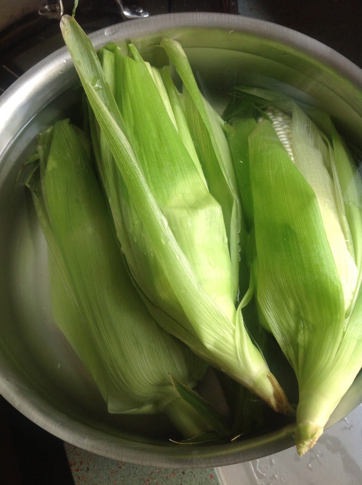 To grill the corn, peel the husks back, but don’t remove them. Clean away the cornsilk and replace the husks. Fill a pot with cool water and one tablespoon of salt and allow the corn to soak for about 10 minutes.