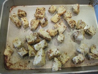 Toss the bread cubes in this sauce and coat evenly. Place on a baking sheet in the oven at 400 degrees and toast for about 5 to 10 minutes. I made these croutons on the grill. I simply placed the baking sheet on the grill alongside the chicken wings on 400 degrees. Toss them frequently and watch them closely so that they don’t burn.