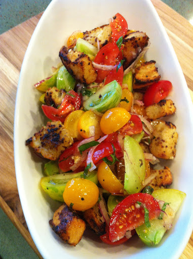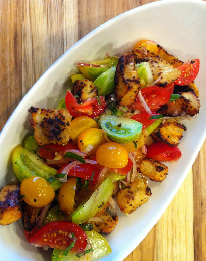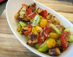 Add the finished, warm croutons to the tomato salad just before serving and mix gently to coat them in the tomato vinaigrette. Serve immediately.