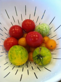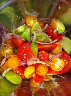 This salad is flexible–just use whatever tomatoes you prefer. As you can see, I used 3 green zebras, 4 campari tomatoes, and a handful of yellow tomatoes.