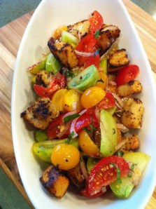 I kept the salad fairly simple, to allow the flavors of the tomatoes shine through. I also made croutons from some leftover homemade bread that I tossed in a mixture of dijon mustard, vermouth and butter. The croutons are a revelation! I’ve made them before and used them in tomato soup–so delicious!