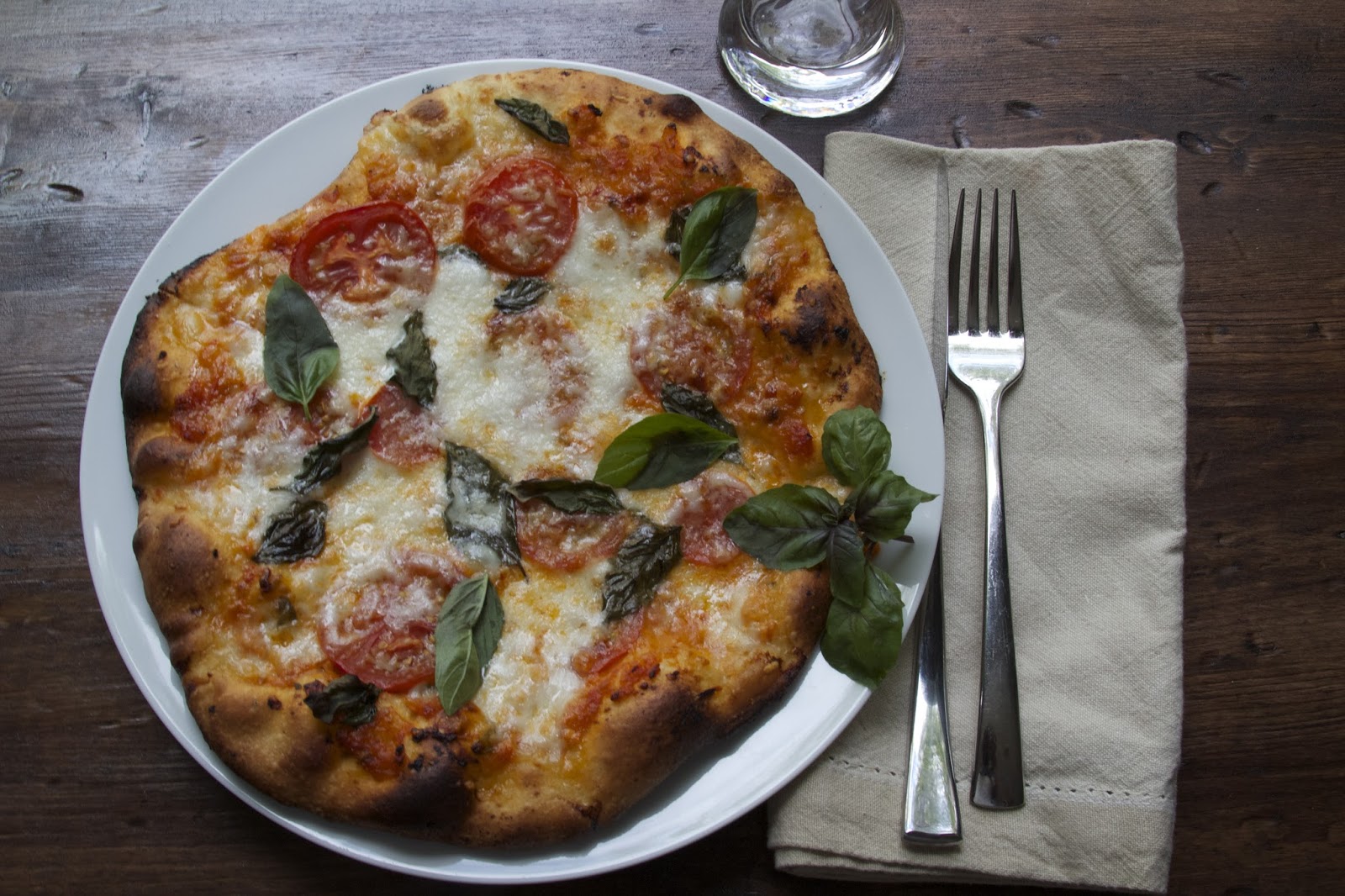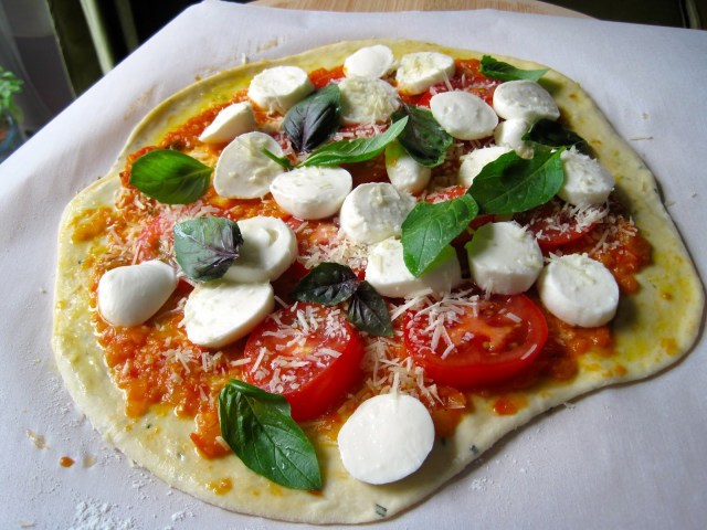 Giusto’s Vita-Grain, but all-purpose flour will also work. To top it off, a simple combination of fresh sliced tomatoes, fresh mozzarella cheese, grated parmesan and fresh basil. Delicious and oh, so simple!