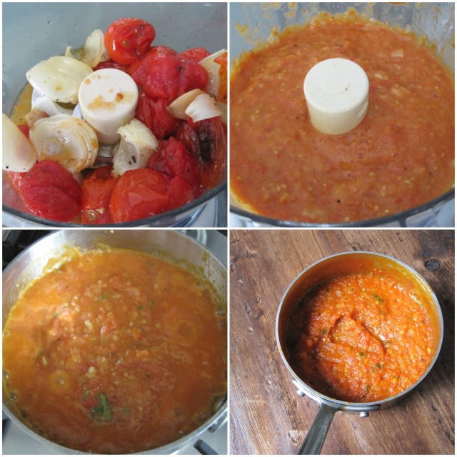 After the tomatoes have finished roasting, pour the entire contents of the pan into the food processor and puree. Then put the puree, along with a tablespoon of freshly chopped oregano, about 1/2 teaspoon of red pepper flake, salt and pepper into a sauce pan over medium high heat. Reduce the sauce until it is thick enough to run a spoon through it and hold its shape.