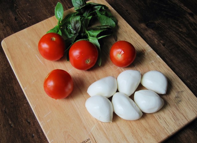 | Three simple, fresh ingredients! Basil, tomatoes, fresh mozzarella. |