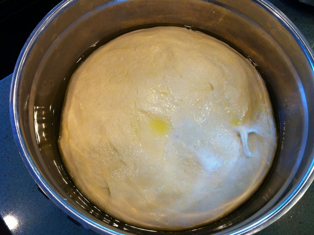 Pour a little olive oil in the bottom of a mixing bowl and place the dough ball inside. Coat with a little more olive oil. Cover the bowl with plastic wrap or a damp kitchen towel and put in a warm spot. A perfect warm spot is in an oven that has been preheated for one minute at 350 degrees. Turn off the oven after one minute and place the bowl inside. Allow the dough to rise for 45 minutes. It should double in size.