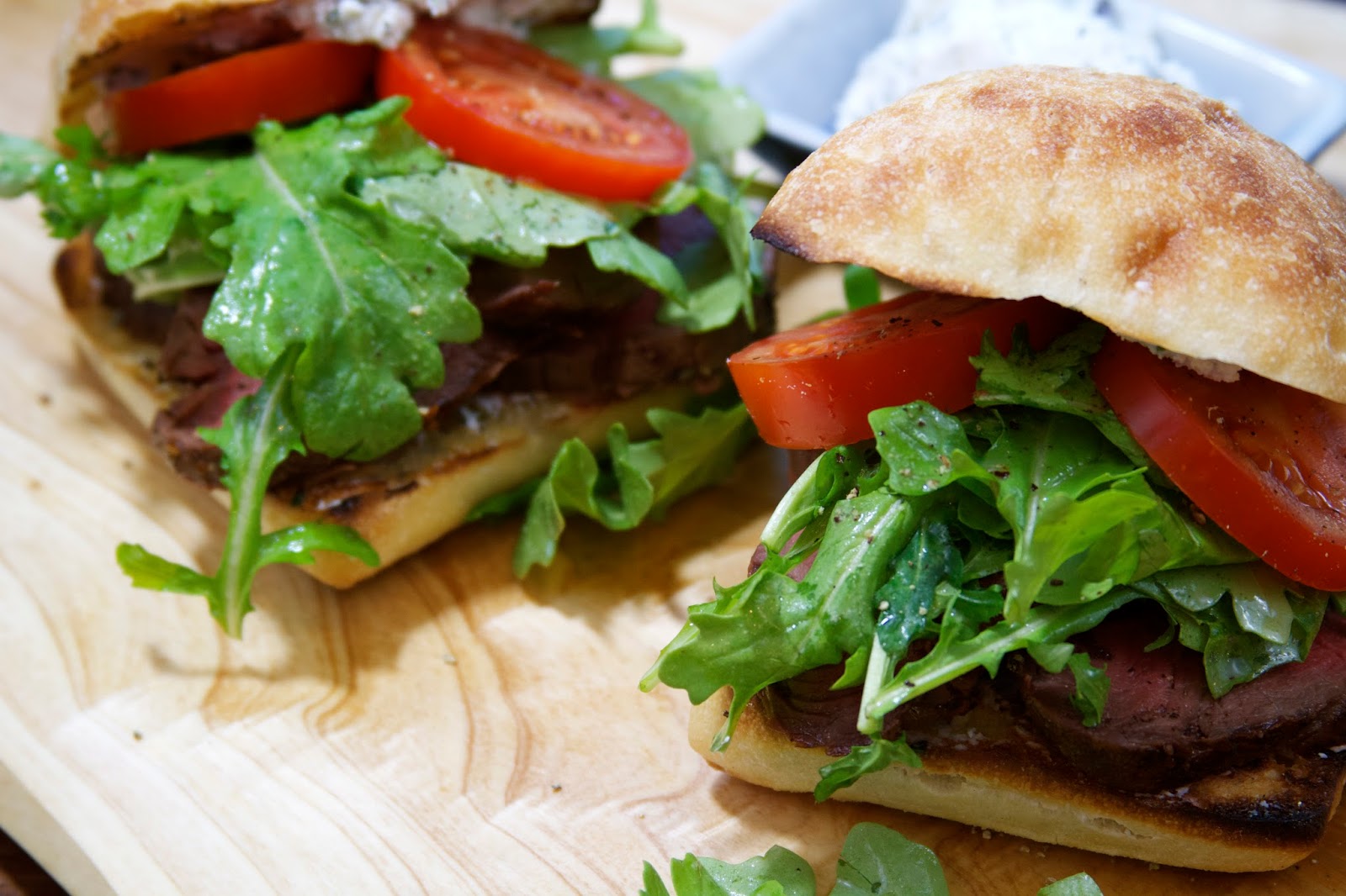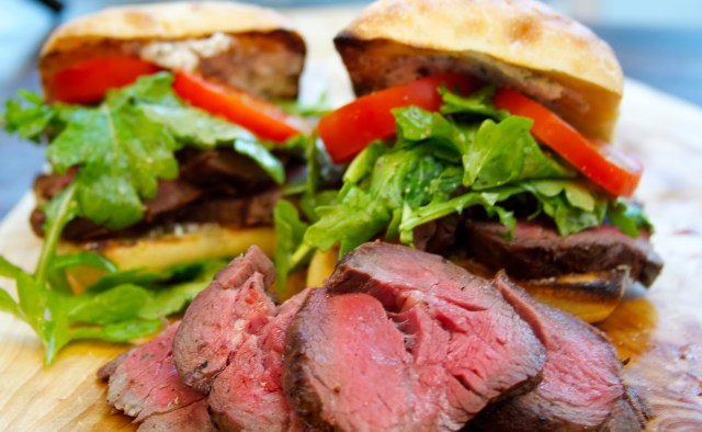 Happy Labor Day weekend! I hope you are all having a great time enjoying this last summer holiday! Maybe you’ve had a chance to fire up the grill this weekend or perhaps you’ve already moved on to the comfort foods of autumn. I have done a little of both. In my head (and in my stomach) I’m already craving those comfort foods–like roasts, homemade bread, creamy polenta baked in the oven…but at the same time, it is still summer, and we in the Southwest have about two more months before we begin to feel the first twinges of cool Fall weather. So, today, I landed on a happy medium. I still got my roast, but made it on the grill, sliced rare and piled on a toasted ciabatta roll topped with goat cheese laced with fresh herbs and a nice handful of peppery arugula.