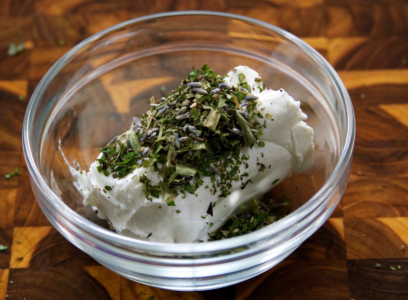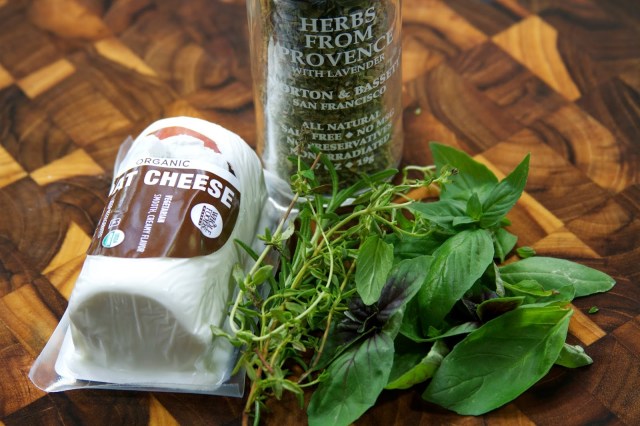 The original sandwich calls for a spread of truffle butter and freshly shaved parmesan. Since truffle butter is an ingredient that necessitates a trip to a specialty store, I tend to skip it altogether. I simply used a small package of goat cheese, mixed in fresh and dried herbs and spread it on the sandwich. It couldn’t be easier! Allowing the goat cheese to come to room temperature makes it soft and easy to stir in the herbs.