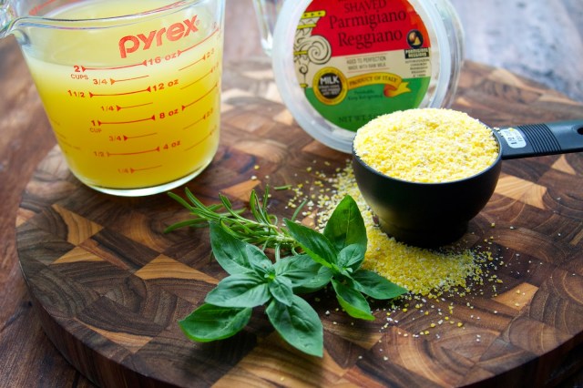 Per serving, use 1/4 cup polenta to 1 cup broth. I made this dish for 2 people, so I used 1/2 cup polenta and 2 cups broth