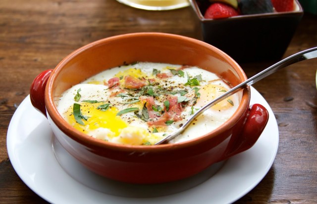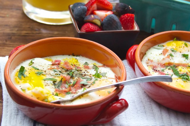 I know I’ve told you how much I love eggs and in this dish, the eggs are gently baked on top of a bed of creamy polenta that’s seasoned with fresh rosemary and basil. Then it’s topped off with a bit of sliced, salty, Prosciutto di Parma and chopped basil. This isn’t the way Momma made it, either, but in a way, this updated dish perfectly blends my Southern upbringing with Eric’s Italian heritage. It’s a lovely dish to make for brunch and it’s easy to assemble for multiple people. Everyone gets their own piping-hot bowl, right from the oven!