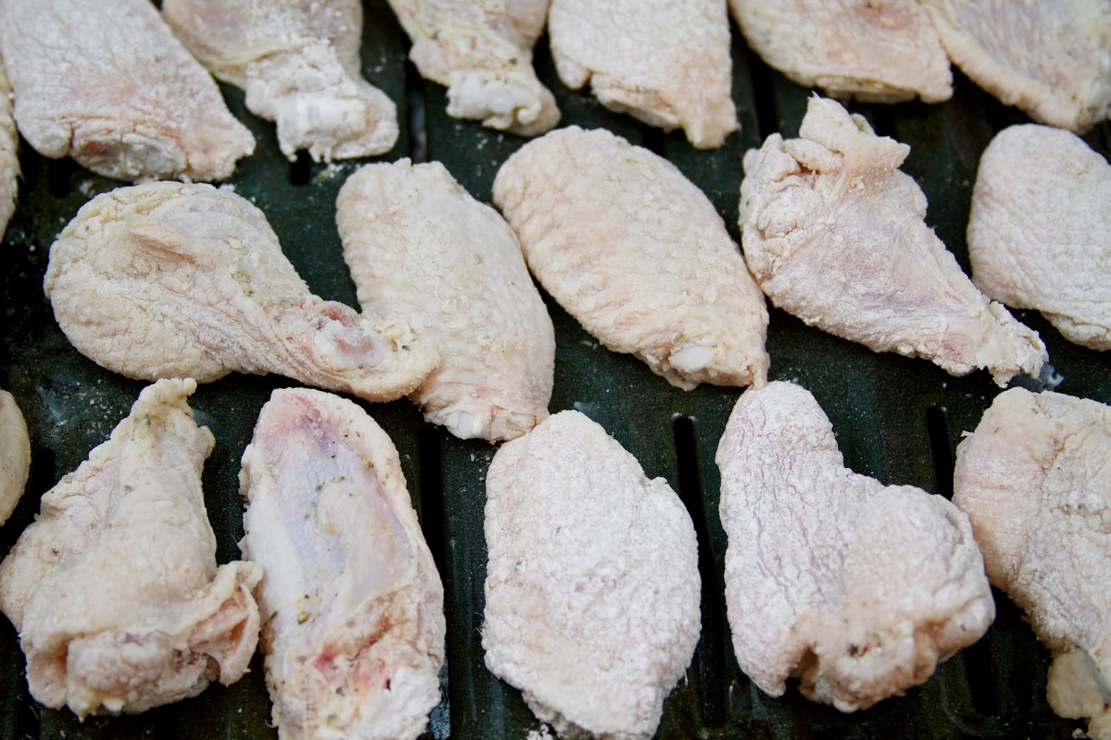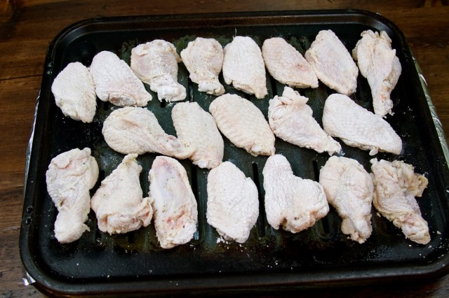 Place about 2 tablespoons of corn starch in a plastic bag. Place a few wings in the bag at a time and shake to lightly coat with the corn starch. Place on an oiled roasting grate and bake for 40 minutes until golden brown and cooked through.