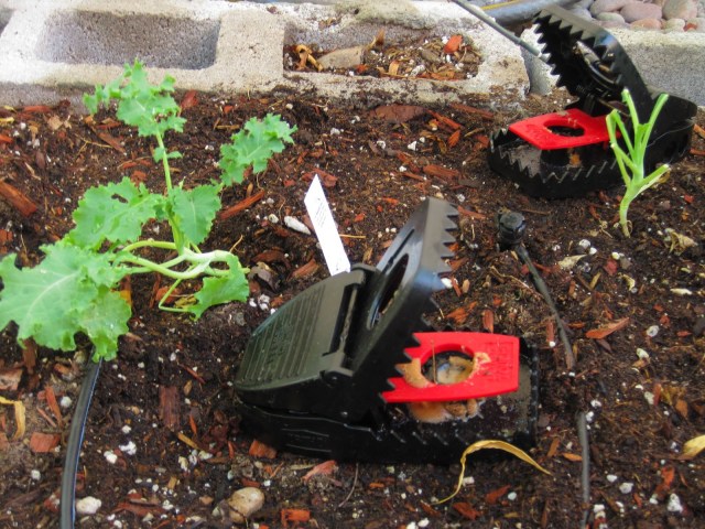 After that, it was pretty much easy. I tilled the soil, added some new soil and fertilized it with epson salts and vegetable fertilizer. On Thursday, I ventured to the garden center and brought home a few seedlings: kale, cilantro, thyme and mint. Then I laid out rows of greens and planted Swiss Chard, collard greens, spinach and lettuce. I was feeling pretty excited and proud of myself until the next morning, when I came out and saw that my brand new, tender kale was just a bunch of naked stems!! RODENTS! Now I am fit to be tied. We set traps, and this morning, there was a rat in the trap! At least, I think it was a rat. It was either a small rat or a large mouse, and since it wasn’t even remotely adorable, I’m going to assume it was a rat. Of course, it was still able to make a meal out of the cilantro and the mint before it met its demise.