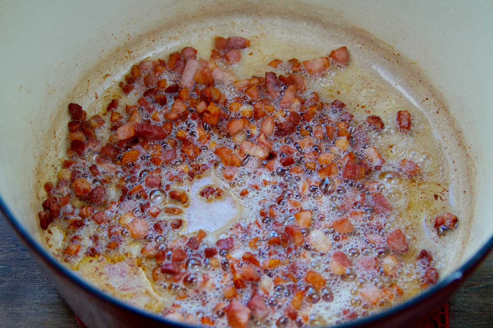 The inspiration for this soup came from this Dave Lieberman recipe. I’ve been making this soup for a few years and I’ve made a few alterations to make it a little spicier and a little smokier. During the holidays, I make it with leftover Christmas ham and it is amazing! The original recipe calls for lots and lots of bacon, and while I love bacon, I like to use diced pancetta because it’s convenient and a little less fat than ten slices of bacon!