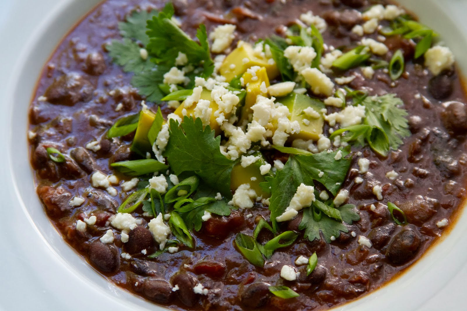 To make the soup creamier, during the last ten minutes of cooking, remove two cups of the soup and puree in a blender or food processor, or use an immersion blender to puree it in the pot. After you’ve blended to your preferred consistency, add the cilantro (about 1/2 cup) and stir. Cook for ten more minutes and serve topped with cheese, cilantro, avocado and more cilantro leaves.