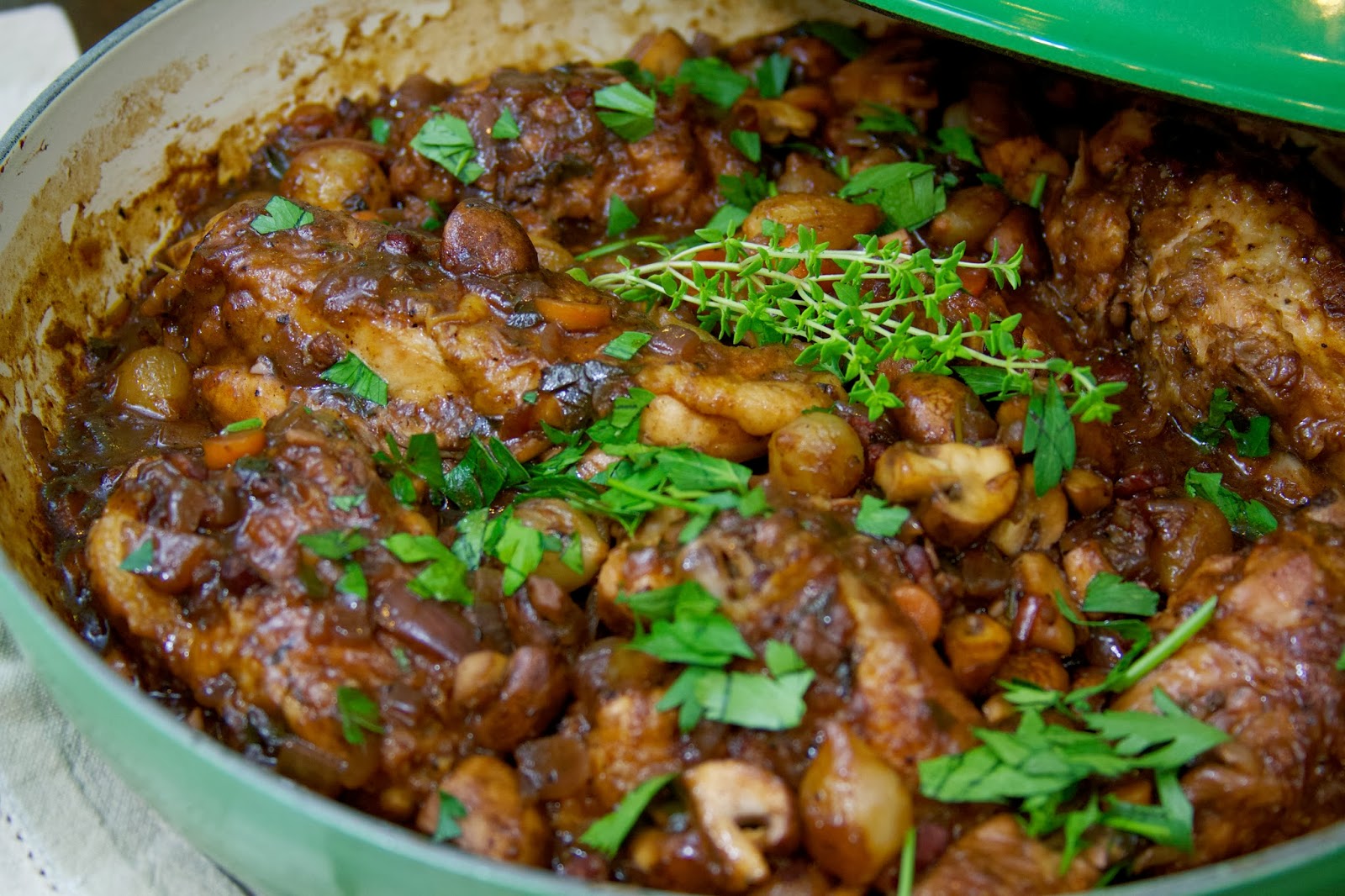 The first time I ever had Coq au Vin was during the summer semester before my senior year in college. One of my favorite professors, who was also a gourmet cook, made this dish and shared it with me and forever changed the way I thought about food. I remember biting into a beautifully browned mushroom bursting with red wine and feeling that I was eating my first adult meal. I also remember wondering if it was ok for me to eat it since I wasn’t yet 21 (I was both very sheltered and very, very square in college)! I remember how special I felt after that first bite–that my professor had thought to share such a lovingly prepared, and to my inexperienced palate, decadent, dish with me! Now I realize that the dish itself is not so much decadent, as it is classic French, rustic, country food, but was every bit lovingly made and incredibly delicious.