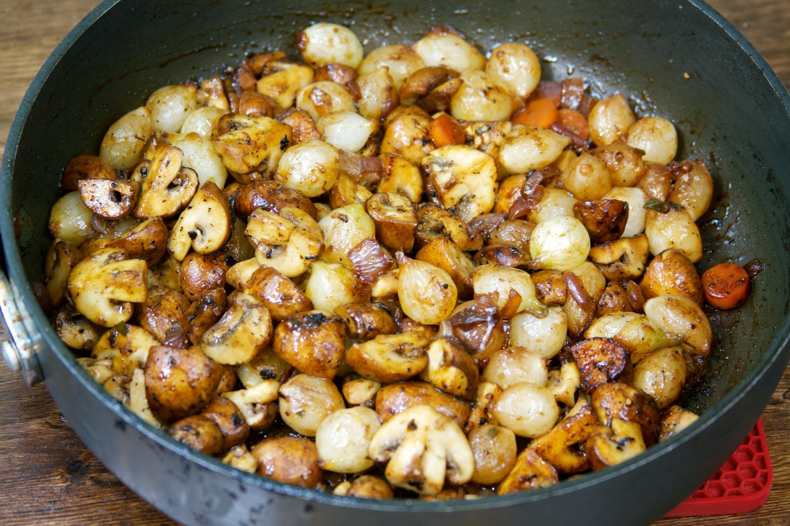 6. Clean and dry the mushrooms and cut into quarters. In a frying pan (I used a non-stick pan for this part) melt 1 tablespoon of butter and add the frozen pearl onions. Toss the onions in the butter and stir or toss until they begin to brown. Add the reserved 1/2 cup of braising liquid and season with a pinch of salt and pepper. Place a lid over the onions and cook for about 4 minutes. Remove the onions from the pan and set aside in a small bowl. Add one more tablespoon of butter to the pan and sear the mushrooms until they are a nice, golden brown color. Add the onions back to the pan and set aside.