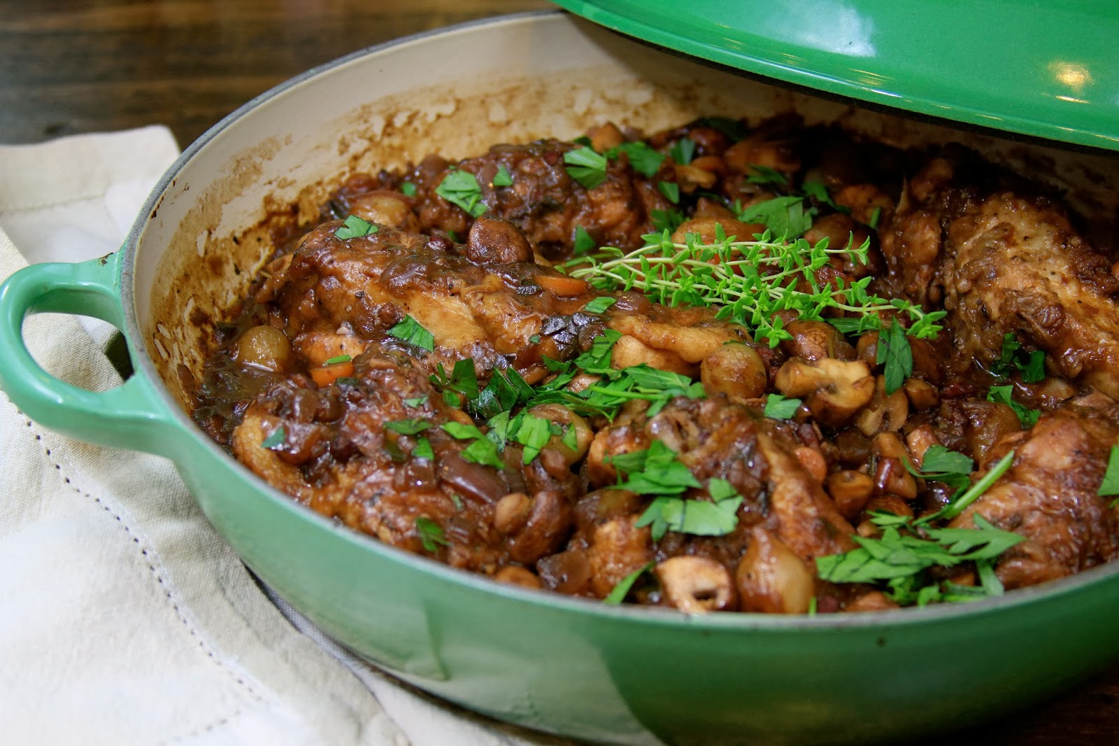 To this day, this is how I love to cook and why I celebrate the Autumn season with rustic, homey, braised dishes. For me, cooking this way shows love. Every component gets special treatment as it goes into the pan and the result is a rich mélange of juicy chicken, robust wine and tender vegetables. It’s a perfect dish to make when you want to show someone that you really care!