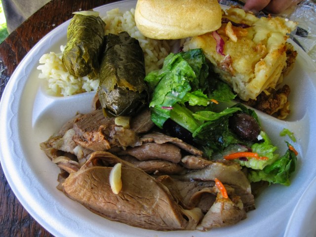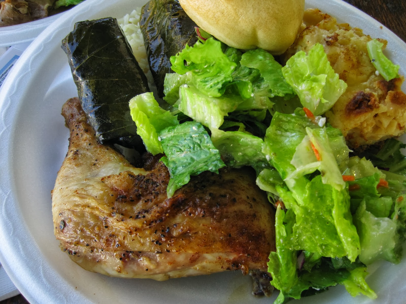 Look at this huge plate of food! Chicken, dolmathes (stuffed grape leaves), pastitsio , lemony rice and Greek salad! I was so full!
