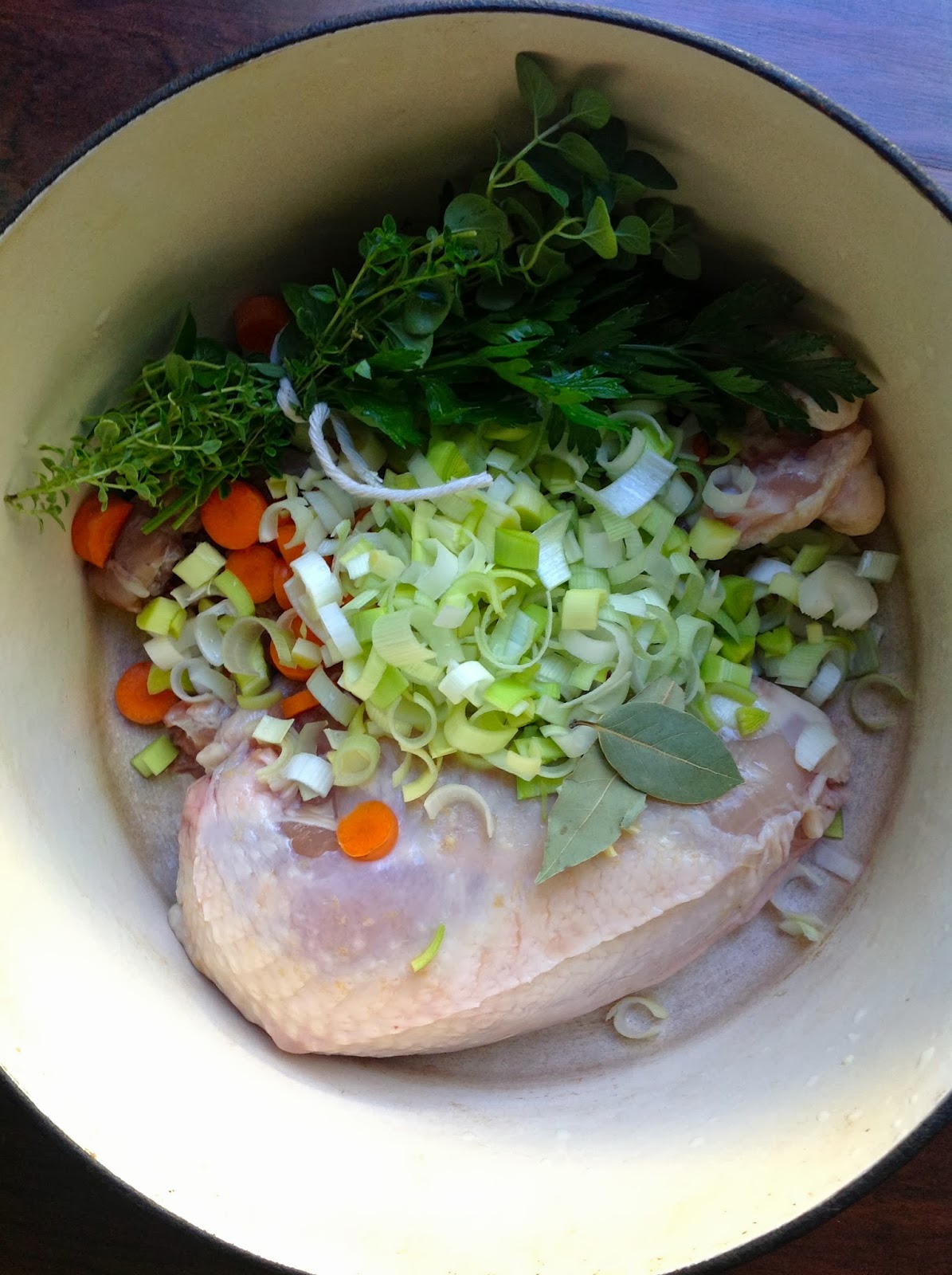 Place the chicken pieces, sliced leeks, carrot, bay leaves, celery and the bouquet garni in a soup pot. Add the chicken stock and 1 teaspoon of salt and pepper and bring to a boil, then lower the temperature to low. Skim off any foam that comes to the surface and discard. Simmer for approximately 45 minutes or until the chicken is completely cooked.
