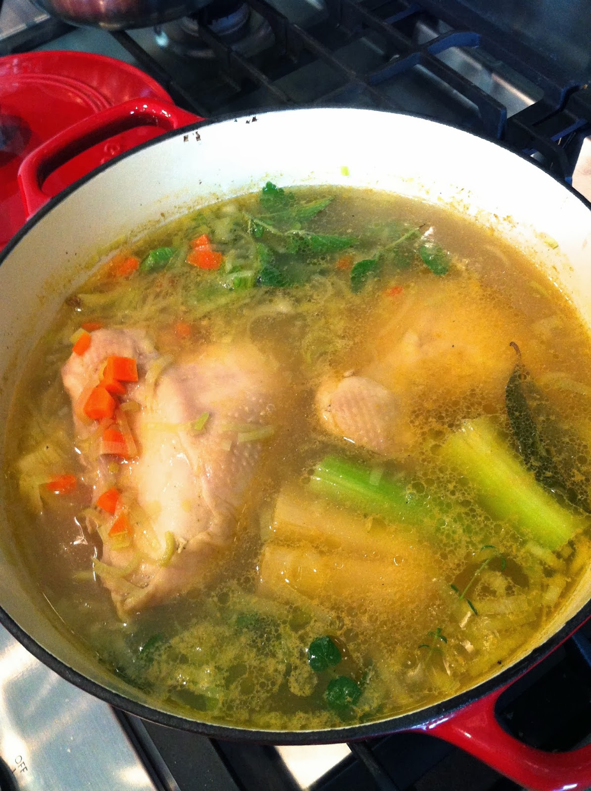 I made this soup this afternoon and it is creamy, lemony bliss in a bowl! I love the tangy zip from the lemon and that the soup is creamy without using any cream. I have been walking by and sneaking ladlefuls of it all evening long. I had to put it away just so I’d stop eating it–it is that good! I adapted this recipe by Cat Cora. My version of the soup is a little less fussy, a little more rustic and perfectly easy for a weekday meal. Instead of starting with a broth from scratch from a whole chicken and water, I make what I call a “double-chicken” broth–chicken pieces cooked in chicken stock, which speeds up the soup making process and allows you to use less meat. Always use bone-in, skin-on chicken when making soup–it’s more flavorful and less expensive, too!