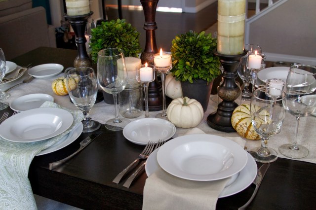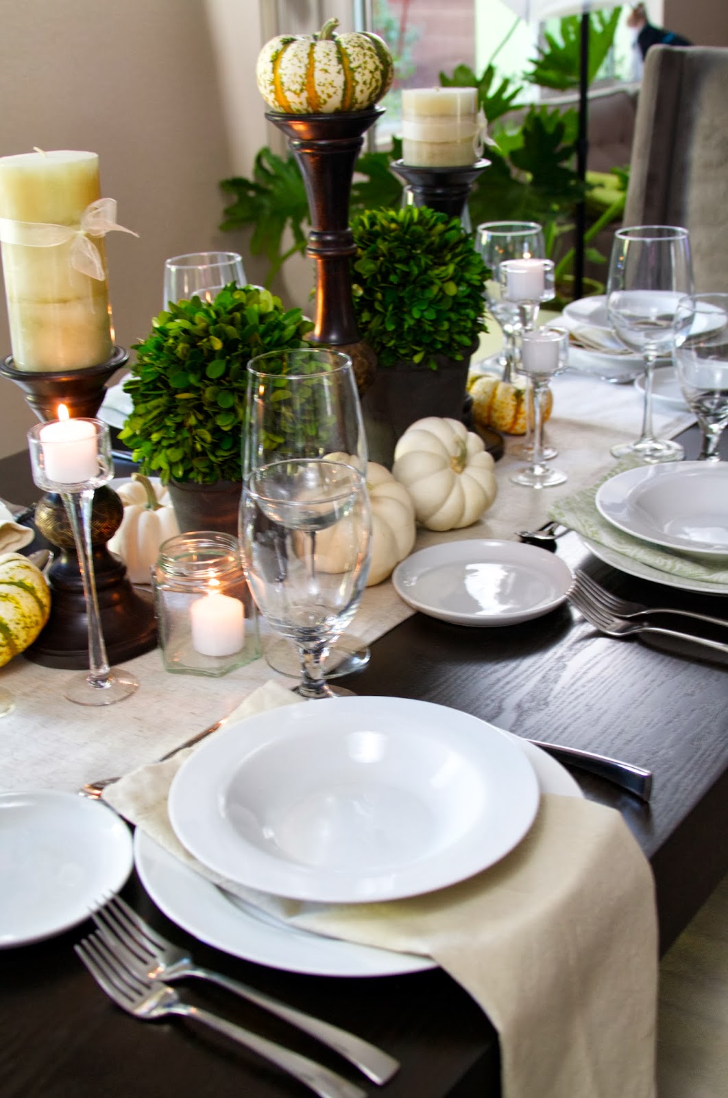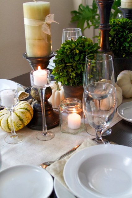 Since the offerings at the store were slim-pickings, I decided to do something a little different this year and settled on a simple, white and green Thanksgiving table. I found two preserved boxwood topiaries at Homegoods and paired them with small white pumpkins (I love those) and white pumpkins with green and orange stripes. I set them on top of a beige table runner and placed some candlesticks and jars with different heights and shapes. I think it turned out pretty well and you can bet that those topiaries will do double duty at Christmas!