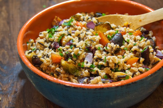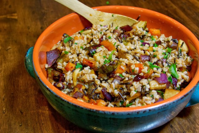 We are full-tilt into the autumn season and I’m busy collecting recipes for Thanksgiving! I came across this beautiful recipe on Williams-Sonoma’s Taste blog and knew I had to make it immediately. I had most of the ingredients on-hand, along with some leftover cubed butternut squash from last week’s Winter Minestrone. I made a few changes to the original recipe by using farro and wild rice instead of wheat berries. I also added some brussels sprouts and cremini mushrooms to the mix as well. This dish was hearty enough to be a main dish on a Meatless Monday, or a delicious side dish and I think it is perfect for Thanksgiving. What’s not to love about whole grains with earthy, roasted root vegetables? Speaking of root vegetables, the roasted parsnips were a revelation! I had never had parsnips before and I love an opportunity to try something new! I wasn’t crazy about the flavor when raw, but when roasted, they had a sweet, herbal flavor–similar to a turnip or a rutabaga. I really enjoyed them and look forward to experimenting with them in the future.