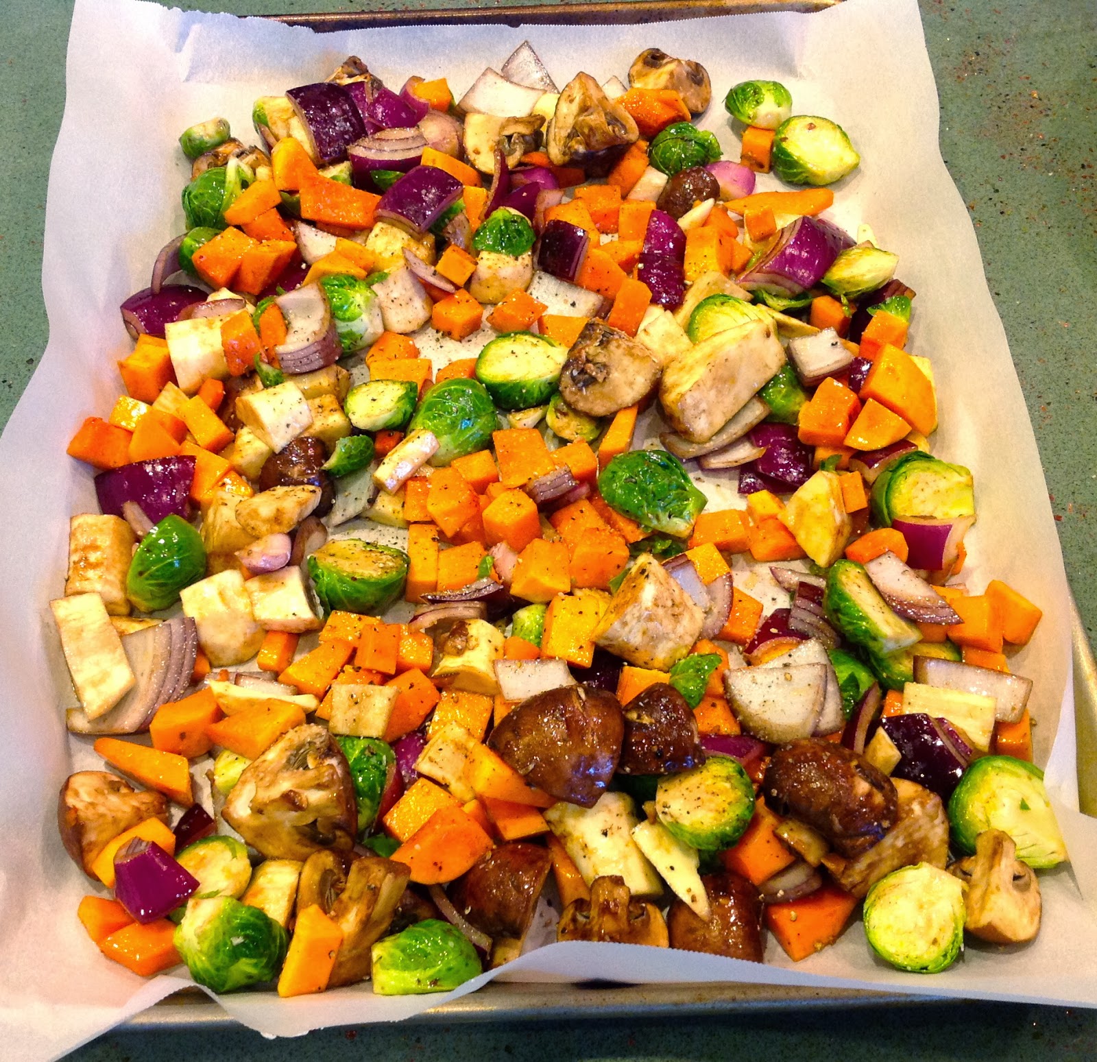 2. Place the cut vegetables in a mixing bowl and toss with the olive oil and balsamic vinegar. Spread the vegetables on a roasting pan lined with parchment paper (or aluminum foil would work as well). Season the vegetables with salt and pepper and roast in the oven for 25 minutes, or until the vegetables are tender.
